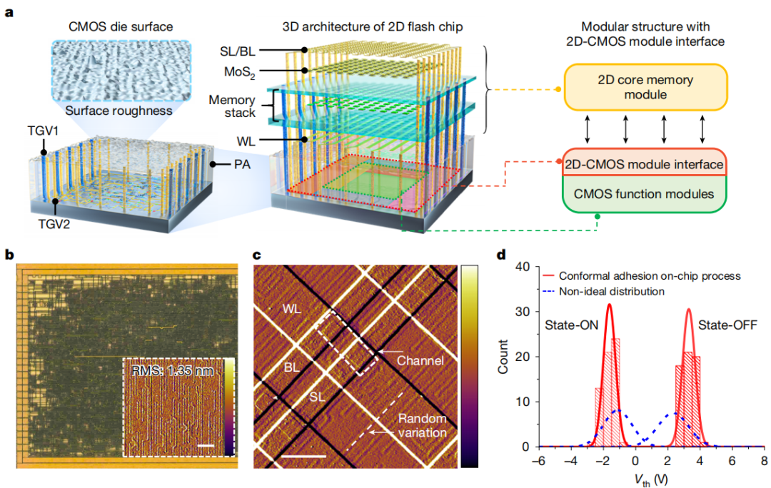 面对这一问题,其中一种破题思路是让磨平的 CMOS 衬底去适应二维材料,但是另一个难题在于人们很难实现原子级的平整。本次团队的思路则是反着来的,即让二维材料去适应 CMOS。二维材料具备一定的柔性,为此他们在模块化集成方案的帮助之下,在制造上将二维存储电路与 CMOS 电路进行分离,然而再利用高密度单片互连技术,在 CMOS 控制电路上实现完整的芯片集成。通过使用一种模块化结构,以及使用一个精心设计的二维 CMOS 模块接口,他们将二维材料和 CMOS 进行连接,通过电路接口的灵活设计,解决了器件技术的兼容性问题。同时,他们利用逐步释放转移和多步多尺度退火的技术,让二维材料能够共形地贴合在起伏不平的 CMOS 表面,这让前者能够温和地释放残余应力。基于这一技术创新,他们在原子尺度上实现了二维材料与 CMOS 衬底的紧密贴合,并实现了较高的良率。