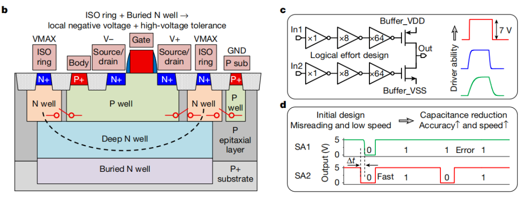 与此同时,其还提出一种跨平台的系统设计集成框架,它便是前面提到的“长缨(CY-01)架构”。一方面,该架构采用了串扰抑制的二维或非门(NOR gate)闪存电路设计方案,即采用或非门架构和半选方案(Half-Select Scheme),借此将编程和擦除串扰引起的阈值电压漂移抑制在极低水平。另一方面,该架构采用了电压域兼容设计方案,针对二维闪存操作所需要的负电压和高电压,该团队在 CMOS 的电源开关模块中设计了隔离 N 型金属氧化物半导体,利用隔离环合深 N 阱,实现了局部负压偏置和高耐压。最后,该架构采用了阻抗匹配设计方案,借此针对字线缓冲器、位线缓冲器和源线缓冲器以及灵敏放大器进行了优化,让它们的驱动能力和读取能力可以和二维闪存模块的阻抗相匹配。具体来说,该团队使用逻辑努力理论(Logical Effort Theory)优化了缓冲器中的反相器链,提升了驱动能力和信号速度。这一架构解决了二维电子器件新机制与传统 CMOS 工艺之间的兼容性问题,完成了二维电路设计与 CMOS 外围电路之间的协同设计和验证。